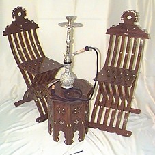 CONJUNTO DUAS CADEIRAS (35,5X36X81 CM) EM MADEIRA TRABALHADA COM MOTIVOS ÁRABES E DETALHES EM MARFIM; DUAS CABECEIRAS (36,5X21 CM), QUE SÃO FIXADAS NAS CADEIRAS, EM MESMO MATERIAL; UMA MESA (40X40X47,5 CM) COM OITO FACES, DO MESMO ESTILO DAS CADEIRAS; E, UM NARGUILÉ, COMPOSTO POR CORPO (VASO EM VIDRO AZUL, COM PINTURAS EM ALTO RELEVO NAS CORES PRATA E BRANCA), ARO, TUBO, PITEIRA COM CORDÃO AZUL E PINÇA.
