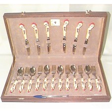 FAQUEIRO EM INOX, COM CABO EM OSSO E CHIFRE DE BÚFALO, NA COR MARFIM, IMITANDO PÁSSARO. COMPOSTO POR 18 PEÇAS, ENTRE TALHERES DE SOBREMESA. ACONDICIONADO EM ESTOJO DE MADEIRA MARCHETADA (47,8X27,5X6 CM). ACOMPANHA INFORMATIVO SOBRE A PEÇA E CARTÃO DE VISITA DO REMETENTE 'RANDA ASSI BERRI / TEL.: 868200/1-607007'.