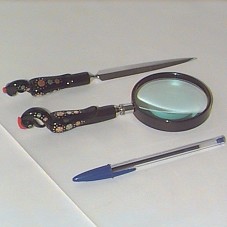 ABRIDOR DE CARTAS EM INOX, COM CABO EM CHIFRE DE BÚFALO, NA COR PRETA, IMITANDO PÁSSARO; E, LENTE DE AUMENTO COM MESMO CABO. ACONDICIONADO EM ESTOJO FORRADO DE NAPA PRETA (24,5X14,5X5 CM). ACOMPANHA INFORMATIVO SOBRE A PEÇA.