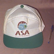 BONÉ EM BRIM BRANCO, COM ABA VERDE. NA FRENTE, ESTAMPA COM INSCRIÇÃO 'ASA / ARTICULAÇÃO NO SEMI-ÁRIDO BRASILEIRO', E SÍMBOLO DA MESMA. ATRÁS, 'FEBRABAN / BRASIL UM PAÍS DE TODOS / GOVERNO FEDERAL'.
