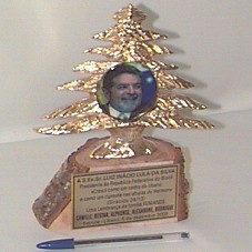 ESCULTURA EM OURO E MADEIRA (23 CM). FIGURA DE UM CIPESTRE (EM OURO) COM FOTO DO PRESIDENTE LULA NO CENTRO FRONTAL; E DO PRESIDENTE E PRIMEIRA DAMA NA PARTE POSTERIOR. FIXADO EM UM PEDAÇO DE CEDRO, ONDE, NA PARTE DA FRENTE, HÁ UMA PLACA (11,2X6 CM) EM METAL DOURADO COM A INSCRIÇÃO 'A S. EX. SR. LUIZ INÁCIO LULA DA SILVA / PRESIDENTE DA REPÚBLICA FEDERATIVA DO BRASIL / CRESCI COMO UM CEDRO DO LIBANO E COMO UM CIPESTRE NAS ALTURAS DO HERMOM (SIRÁCIDA 24/13) / UMA LEMBRANÇA DA FAMILIA FENIANOS / CAMILLE, REGINA, ALPHONSE, ALEXANDRE, RODRIGUE / BEIRUTE-LIBANO, 05 DE DEZEMBRO 2003'.