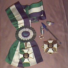 ORDEM DO MÉRITO DA DEFESA, NO GRAU DE GRÃ CRUZ, COMPOSTO POR: UMA FAIXA, COM LISTRAS NAS CORES AZUL, VERDE E BRANCO, COM UMA INSÍGNIA EM FORMATO DE CRUZ, NA COR BRANCA COM LATERAIS DOURADAS, E, NO CENTRO, UM CÍRCULO COM ROSTO GRAVADO E 'MÉRITO DA DEFESA', NO VERSO, 'BRASIL / MINISTÉRIO DA DEFESA' E O BRASÃO DA REPÚBLICA; UMA MINIATURA DE INSÍGNIA FIXADA EM FITA DE MESMAS CORES COM UM BÓTON; UMA PLACA COM MESMA INSÍGNIA E RAIOS DOURADOS AO REDOR; UM BÓTON E UMA BARRETA NAS CORES DA FAIXA, COM INSÍGNIA EM METAL DOURADO NO CENTRO. ACONDICIONADO EM CAIXA (18X31X5 CM) FORRADA DE TECIDO AZUL MARINHO.