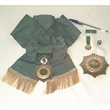 ORDEM DO MÉRITO DA REPÚBLICA DA LÍBIA, COMPOSTA POR: FAIXA VERDE COM DETALHES DOURADOS, COM INSÍGNIA CIRCULAR, DE OITO PONTAS, EM METAL DOURADO E DETALHES EM VERDE, COM INSCRIÇÕES EM ÁRABE; UMA PLACA IGUAL À INSÍGNIA; UMA FITA COM MINIATURA DA MESMA; UM BÓTON E UMA BARRETA EM TECIDO VERDE COM DETALHES DOURADOS. ACONDICIONADO EM CAIXA (24X32X5 CM) FORRADA DE VELUDO VERDE, TENDO NA TAMPA, DETALHES DOURADOS, UM FALCÃO E INSCRIÇÕES ÁRABES.