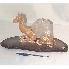 ESCULTURA (14 CM) DE UM CAMELO, CONFECCIONADO EM OURO E CRISTAL, SENTADO SOBRE BASE DE ROCHA CRISTALINA, EM TONALIDADES DE PRETO, MARROM E AZUL. NO CANTO DIREITO DA BASE, PLACA (1,5X2,5 CM), EM FORMA DE BRASÃO, COM A INSCRIÇÃO 'SULTAN BIN ZAYED AL NAHYAN'. ACONDICIONADA EM CAIXA DE COURO PRETO, REVESTIDA INTERNAMENTE EM CAMURÇA BEGE, COM ABERTURA FRONTAL, E INSCRIÇÃO 'CARRERA Y CARRERA MADRID 1885'.