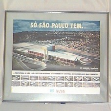 CARTAZ (61X51,5 CM) COM FOTO DE PARTE DA CIDADE DE SÃO PAULO, MOSTRANDO UMA DAS UNIDADE DO CENTRO EDUCACIONAL UNIFICADO, 'CEU JAMBEIRO - ZONA LESTE. INAUGURADO EM 1º DE AGOSTO.'. POSSUI A INSCRIÇÃO, 'SÓ SÃO PAULO TEM / A PREFEITURA DE SÃO PAULO ESTÁ ENTREGANDO 21 UNIDADES DO CEU PARA AS COMUNIDADES MAIS CARENTES.'. NA PARTE INFERIOR, VINTE FOTOS PEQUENAS DE OUTRAS UNIDADES. POSSUI MOLDURA (74X64,5 CM) TIPO SANDUÍCHE DE VIDRO.