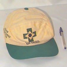 BONÉ EM BRIM AMARELO, COM ABA VERDE. NA FRENTE, ESTAMPA COM UMA CRUZ NAS CORES DA BANDEIRA BRASILEIRA E A INSCRIÇÃO 'MINISTÉRIO DA SAÚDE'. NAS LATERAIS, 'AGENTE COMUNITÁRIO DE SAÚDE', E 'PROGRAMA SAÚDE DA FAMÍLIA'. DENTRO DO BONÉ, ESCRITO COM CANETA ESFEROGRÁFICA, 'CLAUDITA LEITE / POÇÕES BA'.