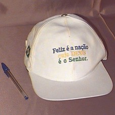 BONÉ EM BRIM BRANCO. NA FRENTE, BORDADO NAS CORES DA BANDEIRA BRASILEIRA A INSCRIÇÃO 'FELIZ É A NAÇÃO CUJO DEUS É O SENHOR.'; ATRÁS, 'SANTO ANTÔNIO DE JESUS - BA'; NAS LATERAIS, A BANDEIRA DO BRASIL E DA CIDADE DA BAHIA.