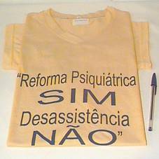 CAMISETA (TAM M), EM MALHA AMARELA, DE MANGA CURTA E GOLA EM 'V'. NA FRENTE, ESTAMPA EM AZUL, COM A INSCRIÇÃO 'REFORMA PSIQUIÁTRICA SIM / DESASSISTÊNCIA NÃO'. ATRÁS, 'HOSPITAL PSIQUIÁTRICO HUMANIZADO SIM / FECHADO NÃO'.