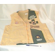 COLETE BRIM AMARELO, COM ZÍPER FRONTAL. NA FRENTE, ESTAMPA COM UMA CRUZ NAS CORES DA BANDEIRA BRASILEIRA E A INSCRIÇÃO 'AGENTE COMUNITÁRIO DE SAÚDE / MINISTÉRIO DA SAÚDE / PROGRAMA SAÚDE DA FAMÍLIA'. ATRÁS, 'PROGRAMA SAÚDE DA FAMÍLIA', E RESPECTIVO SÍMBOLO.