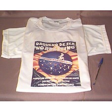 CAMISETA (TAM G), EM ELANCA FINA, NA COR BRANCA, DE MANGA CURTA. NA FRENTE, ESTAMPA COLORIDA, TENDO COMO FUNDO A BANDEIRA BRASILEIRA, E A INSCRIÇÃO 'ORGULHO DE SER NORDESTINO / 12ª CONFERÊNCIA NACIONAL DE SAÚDE / PREFEITURA MUNICIPAL DE JUAZEIRO DO NORTE / SECRETARIA DE SAÚDE / COMPROMISSO COMUNITÁRIO'.