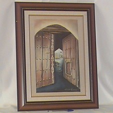 DESENHO (26X42,5 CM) EM PASTEL. FIGURA DE UMA PORTA ÁRABE SEMI ABERTA, MOSTRANDO PARTE DO INTERIOR DE UM RECINTO. PREDOMINA OS TONS DE MARROM, AZUL, PRETO E BRANCO. NO CANTO INFERIOR DIREITO, 'LÚCIA RUSSO'. MOLDURA (48X62,5 CM) EM MADEIRA ESCURA, COM DETALHES DOURADOS; PASSE-PARTOUT CREME. ATRÁS, 'SENHOR PRESIDENTE E ESPOSA / COM CARINHO E ADMIRAÇÃO LÚCIA RUSSO MIRANDA / ARTISTA PLÁSTICA / RIO GRANDE / RS / 053 2321230 / MAUA 1 / RIO GRANDE'. ACOMPANHA CARTÃO DE VISITA DA ARTISTA.