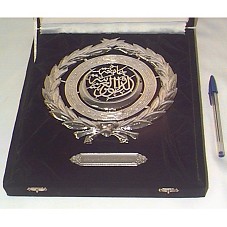 INSÍGNIA (19X20 CM) DA LIGA DOS ESTADOS ÁRABES, EM PRATA, COM SUPORTE DE MESA, TIPO PORTA-RETRATO, FIXADO NA PARTE POSTERIOR. ACONDICIONADO EM CAIXA (25X30X5 CM) FORRADA DE VELUDO VERDE ESCURO, COM DETALHES EM DOURADO, E MESMO SÍMBOLO EM DOURADO, VERMELHO E VERDE NO CENTRO DA TAMPA. FIXADO NA PARTE INTERNA DA CAIXA, PLACA (10X2 CM) EM PRATA, COM A INSCRIÇÃO 'LEAGUE OF ARAB STATES'.