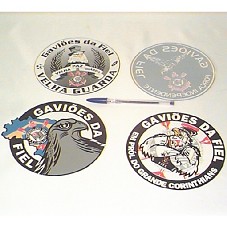 SETE ADESIVOS CIRCULARES (16 CM) DA TORCIDA DO SPORT CLUB CORÍNTHIANS PAULISTA, SENDO TRÊS REPETIDOS. TODOS POSSUEM A INSCRIÇÃO 'GAVIÕES DA FIEL' E O MASCOTE DO TIME, O GAVIÃO.