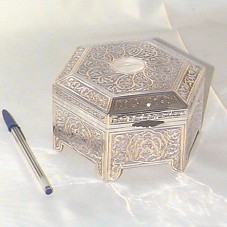 PORTA JÓIA (13,5X8,5 CM), SEXTAVADO, EM PRATA, COM DESENHOS GRAVADOS, FORRADO INTERNAMENTE COM VELUDO AZUL MARINHO. NO CENTRO DA TAMPA, ASSINATURA NÃO IDENTIFICADA. ACONDICIONADO EM ESTOJO (22X23X11,5 CM) DE VELUDO AZUL MARINHO. ACOMPANHA CARTÃO DE APRESENTAÇÃO DO REMETENTE.