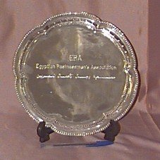 PRATO DECORATIVO (26 CM) EM PRATA. POSSUI BORDAS TRABALHADAS EM ARCOS E SEMI-ESFERAS (EM ALTO RELEVO); A INSCRIÇÃO 'EBA / EGYPTIAN BUSINESSMEN'S ASSOCIATION', E OUTRA EM ÁRABE. ACOMPANHA SUPORTE DE MESA, EM PLÁSTICO PRETO. ACONDICIONADO EM CAIXA DE VELUDO AZUL MARINHO (34,5X34,5X7,5 CM).