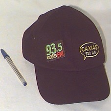 BONÉ EM BRIM PRETO. NA FRENTE, BORDADO EM VERDE E VERMELHO, '93.5 CAXIAS FM'; E, EM AMARELO E BRANCO, 'CAXIAS 930 AM'.