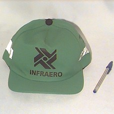 BONÉ EM TECIDO VERDE, COM FAIXA DE SINALIZAÇÃO NAS LATERAIS E TECIDO EM TELA PRETA NA PARTE POSTERIOR. NA FRENTE, INSCRIÇÃO 'INFRAERO' E SÍMBOLO DO EMPRESA.
