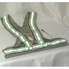 COLETE SINALIZADOR EM FAIXAS EM TELA PRETA, COM FAIXAS VERDES DE TECIDO LUMINOSO. NA PARTE FRONTAL ESQUERDA, INSCRIÇÃO 'INFRAERO / AEROPORTO INTERNACIONAL DE BRASÍLIA PRESIDENTE JUSCELINO KUBITSCHEK', E SÍMBOLO DO EMPRESA.
