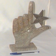 ESCULTURA (25 CM) EM PEDRA-SABÃO. FIGURA DE UMA MÃO COM DOIS DEDOS FORMANDO UM 'L', E UMA ESTRELA ENTRE ELES.