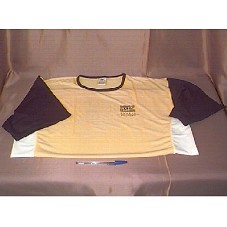 DUAS CAMISETAS (TAM U) DE FUTEBOL, EM MALHA AMARELA, FAIXA BRANCA NAS LATERAIS, MANGAS PRETAS E CURTAS. NA FRENTE, NO CANTO SUPERIOR ESQUERDO, EM PRETO, 'BM&F / BRASIL / ATLETISMO'; ATRÁS, MESMA ESTAMPA E, AINDA, 'MIZUNO'.