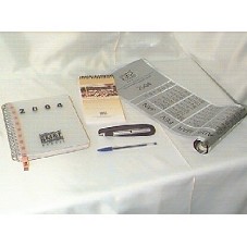 CANETA (13,5 CM) EM METAL PRATEADO FOSCO COM DETALHES POLIDOS E EM BORRACHA PRETA. NA PARTE SUPERIOR, EM PRETO, 'BM&F / BRASIL / BOLSA DE MERCADORIAS & FUTUROS'. ACONDICIONADA EM CAPA DE COURO PRETA. ACOMPANHA UMA AGENDA DO ANO DE 2004, COM LOGOTIPO DA INSTITUIÇÃO NA CAPA; UM BLOCO DE ANOTAÇÕES; E TRÊS CALENDÁRIOS DE PAREDE, EM PAPEL PRATA, ENROLADOS E ACONDICIONADOS EM TUBO DE PAPELÃO.
