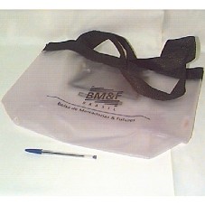 BOLSA EM PLÁSTICO TRANSPARENTE (45X33 CM), COM DETALHES E ALÇAS PRETAS. NA PARTE CENTRAL DA FRENTE, EM PRETO, 'BM&F / BRASIL / BOLSA DE MERCADORIAS & FUTUROS'. POSSUI UM BOLSO INTERNO, COM OUTRO BOLSO.
