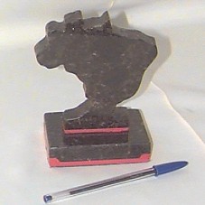 ESCULTURA (12 CM) EM GRANITO PRETO, FIGURA DO MAPA DO BRASIL. ENCAIXADA EM BASE (9,7X6,7X2,3 CM) DE MESMO MATERIAL.