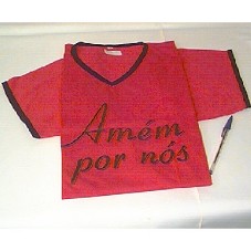 DUAS CAMISETAS (TAM M E GG), EM MALHA VERMELHA, DE MANGA CURTA, COM DETALHES PRETOS NAS MANGAS E GOLA. NA FRENTE, A INSCRIÇÃO 'AMÉM POR NÓS'; ATRÁS, UM POEMA, 'TENHO EM MIM REVOLUÇÕES LEGENDADAS DE EFEITOS ESPECIAIS QUE NINGUÉM ME TIRA MAIS NADA PORQUE MEU TUDO É DIVINAL TÃO COMUM E É TOTAL / ANTONIA ROSA'.