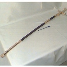 ESPADA (97 CM) EM METAL PRATEADO, COM PUNHO TRABALHADO EM METAL DOURADO, MARFIM E FILIGRANA. COLOCADA EM BAINHA (88 CM) DE RESINA PRETA COM DETALHES EM METAL DOURADO. ACONDICIONADA EM MALETA (105,5X21,8X9 CM) FORRADA DE COURO PRETO. NA PARTE INTERNA, DUAS PLACAS EM METAL DOURADO. NA PRIMEIRA, 'ESPADA CEL. PLÁCIDO DE CASTRO - LIBERTADOR DO ACRE / CENTENÁRIO DO TRATADO DE PETRÓPOLIS 1903/2003'; NA SEGUNDA, 'RÉPLICA DA ESPADA UTILIZADA EM COMBATE PELO CEL. PLÁCIDO DE CASTRO DURANTE A REVOLUÇÃO ACREANA'.