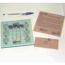 JOGO 'NOVOS CAMINHOS', COMPOSTO POR: TABULEIRO EM VIDRO (14X14X0,6 CM); OITO GEMAS DE PEDRAS, SENDO QUATRO BRANCAS E QUATRO PRATAS; UM INFORMATIVO SOBRE O JOGO E AS REGRAS; E, UM PAPEL CONTENDO A SOLUÇÃO DO JOGO. ACONDICIONADO EM EMBALAGEM DE PAPELÃO (16,5X15X4 CM) E SACO DE JUTA COM ETIQUETA 'SATA / GROUND HANDLING SERVICES'. ACOMPANHA CARTÃO DE VISITA DO REMETENTE.