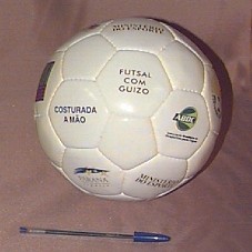 BOLA DE FUTEBOL DE SALÃO COM GUIZO, EM COURO BRANCO, COSTURADA À MÃO. POSSUI DIVERSOS SÍMBOLOS ESTAMPADOS, ENTRE LOGOTIPOS DO GOVERNO FEDERAL E ESTADUAL, E DE ENTIDADES DESPORTIVAS.