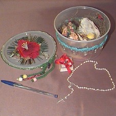ARTESANATO MONTADO EM EMBALAGEM CIRCULAR PLÁSTICA (15X9 CM), TENDO NA PARTE INTERNA, BIBELÔ COM O MENINO JESUS, MARIA E JOSÉ, FIXADO EM CONCHA MARINHA; UMA AMPOLA PLÁSTICA COM 'ATIVADOR E RESTAURADOR DA FUNÇÃO HEPÁTICA'; E UM TERÇO EM CONTAS PEROLIZADAS. EMBALAGEM DECORADA COM CROCHÊ, MIÇANGAS, FLORES ARTIFICIAIS.
