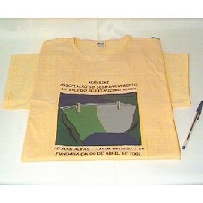 CAMISETA (TAM GG) EM MALHA AMARELA, DE MANGA CURTA. NA FRENTE, ESTAMPA EM VERDE, AZUL E CINZA, COM A INSCRIÇÃO 'ADEVRIMI / ASSOCIAÇÃO DO DESENVOLVIMENTO DO VALE DO RIO ITAPICURU MIRIM / PEDRAS ALTAS - CAPIM GROSSO - BA / FUNDADA EM 06 DE ABRIL DE 2002.'.