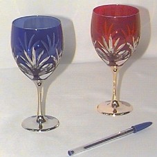 DUAS TAÇAS (15,5 CM) PARA VINHO. A PRIMEIRA, COM PÉ EM METAL PRATEADO E COPO EM VIDRO AZUL COM DESENHOS TRANSPARENTES. A SEGUNDA, PÉ EM METAL DOURADO, E COPO EM VIDRO AVERMELHADO. ACONDICIONADAS EM ESTOJO DE MADEIRA (17,7X17,7X9,2 CM) COM IDEOGRAMAS JAPONESES GRAVADOS, EM DOURADO, NA TAMPA.