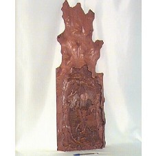 ESCULTURA DE PAREDE (29X90 CM) EM MADEIRA. NA PARTE INFERIOR, IMAGEM DE UMA ÍNDIA À BEIRA DE UM RIO ESCULPIDA NA MADEIRA. NA LATERAL DIREITA, 'F. PIRES / MANACAPURU - AM'.