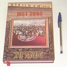 AGENDA 2004, EM CAPA DURA, TENDO NA FRENTE, FOTO DE HOMENS COM ENXADAS E FOICES, E A BANDEIRA DO MST; E, AINDA A INSCRIÇÃO 'AGENDA MST 2004 / 20 ANOS'. NO VERSO DA FOLHA DE ROSTO, 'AO PRESIDENTE LULA COM CARINHO E APREÇO / MARIA BARBOSA MARISINHA'.