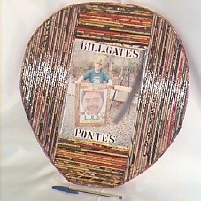 QUADRO (36X39 CM) MONTADO COM FOLHAS DE REVISTAS E JORNAIS ENROLADAS, FORMANDO TUBOS QUE FORAM COLADOS UNS AOS OUTROS. NA FRENTE, FOTO DE UMA CRIANÇA, SEGURANDO UM QUADRO NO MESMO ESTILO, COM FOTO DO PRESIDENTE LULA, E A INSCRIÇÃO 'BILL. GATES PONTES'. ATRÁS, FOTO DE CRIANÇA, COM A INSCRIÇÃO 'BILL. GATES PONTES POBRE'.
