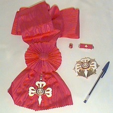 ORDEM DO MÉRITO CULTURAL, COMPOSTA POR: FAIXA VERMELHA COM INSÍGNIA EM DESENHO SEMELHANTE A UMA CRUZ, NA COR BRANCA, COM DETALHES DOURADOS, TENDO AO CENTRO, UM CÍRCULO COM DESENHO DE UMA COROA DE RAMOS E UM LIVRO, E A INSCRIÇÃO 'ORDEM DO MÉRITO CULTURAL', ATRÁS, BRASÃO DA REPÚBLICA FEDERATIVA DO BRASIL; UMA PLACA COM MESMA INSÍGNIA, RODEADA POR RAIOS DOURADOS; UMA BARRETA EM TECIDO VERMELHO COM SÍMBOLO DA INSÍGNIA EM DOURADO; E UM BÓTON NO MESMO MATERIAL DA BARRETA. ACONDICIONADO EM ESTOJO VERMELHO (18X28X8 CM).
