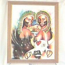 ÓLEO SOBRE TELA (99X78 CM), EM TONS DE AMARELO, VERDE, AZUL, BRANCO, VERMELHO, ROSA, LARANJA E PRETO, COM O PERFIL DE 02 (DUAS) ÍNDIAS, UMA IGREJA AO FUNDO E A CARA DO BOI GARANTIDO. MOLDURA EM MADEIRA.