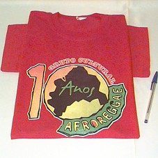 CAMISETA (TAM GG) EM MALHA VERMELHA, DE MANGA CURTA. NA FRENTE, ESTAMPA EM VERDE, PRETO, VERMELHO E AMARELO, COM A INSCRIÇÃO '10 ANOS GRUPO CULTURAL AFROREGGAE'. ATRÁS, 'JOVEM QUE VESTE ESTA CAMISA NÃO PRECISA DE OUTRA COBRINDO O ROSTO.'.
