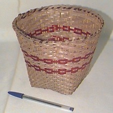CESTA EM PALHA (8,5X18,5X14 CM ), TIPO CACHEPÔ, COM DETALHE DE FAIXAS NA COR VINHO EM SEU DIÂMETRO.