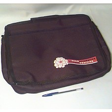 PASTA EM POLIÉSTER PRETO, COM PINTURA DE UMA FLOR BRANCA, CONTORNADA EM VERMELHO E A INSCRIÇÃO 'AÇÃO AFIRMATIVA ATITUDE POSITIVA', EM BRANCO E PRETO SOBRE FUNDO VERMELHO.