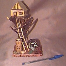 ARTESANATO 'LEMBRANÇA DE PARINTINS' CONFECCIONADO EM MADEIRA, SEMENTE E CONCHA. UMA CASA, EM CIMA DE UMA ÁRVORE, COM ESCADA PARA SEU ACESSO, E O BOI CAPRICHOSO AO PÉ DA ESCADA.