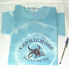 CAMISETA (TAM M) EM MALHA AZUL, DE MANGA CURTA, COM PINTURA BRANCA, TIPO BATIQUE. NA FRENTE, BORDADO EM AZUL E PRETO, 'CAPRICHOSO / PARINTINS-AM' E FIGURA DE UM BOI. ATRÁS, EM AZUL, UMA ESTRELA E 'AMAZONAS / BRASIL'. ACONDICIONADA EM SACO DE JUTA COM O MESMO BOI BORDADO NA FRENTE E 'CAPRICHOSO'.