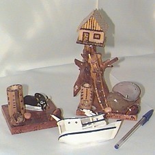03 (TRÊS) ARTESANATOS CONFECCIONADOS EM MADEIRA, BAMBU, SEMENTE E CONCHA: EMBARCAÇÃO EM MADEIRA PINTADA DE BRANCO, COM DETALHES AZUL MARINHO E VERDE; LEMBRANÇA DE PARINTINS, COM O BOI 'CAPRICHOSO' E LEMBRANÇA DE PARINTINS COM CASA EM MADEIRA, EM CIMA DE UM TRONCO DE ÁRVORE.