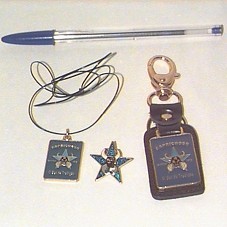 01 (UM) CHAVEIRO,EM METAL E COURO; 01 (UM) BÓTON E 01 (UM) CORDÃO COM MEDALHA, EM METAL, COM O EMBLEMA DE 'CAPRICHOSO - O BOI DA TRADIÇÃO'. ACONDICIONADOS EM SACO DE TNT BRANCO AMARRADO COM FITA DE CETIM AZUL.