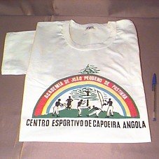 CAMISETA (TAM G) EM MALHA BRANCA, DE MANGA CURTA. NA FRENTE, ESTAMPA DE UMA RODA DE CAPOEIRA, EM VERDE, PRETO, VERMELHO, AZUL E AMARELO, COM A INSCRIÇÃO 'ACADEMIA DE JOÃO PEQUENO DE PASTINHA / CENTRO ESPORTIVO DE CAPOEIRA ANGOLA'.