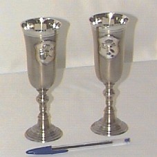 DUAS TAÇAS DE VINHO (17 CM), EM ESTANHO, ÉPOCA MEDIEVAL. NA FRENTE, BRASÃO COM A INSCRIÇÃO 'ER' E UMA COROA. ACOMPANHA CÓPIA DO BILHETE DO REMETENTE, 'CARO PRESIDENTE E AMIGO LULA, COM MEUS CUMPRIMENTOS PELO ÊXITO DO PRIMEIRO ANO, SUGIRO-LHE UM BRINDE NAS TAÇAS DE ESTANHO DE SÃO JOÃO DEL REI. SOB A INSPIRAÇÃO DA HISTÓRIA E DA POESIA DE MINAS. TENHA UM FELIZ NATAL E UM GRANDE 2004, EXTENSIVOS A D. MARISA. DO AMIGO AÉCIO.'.