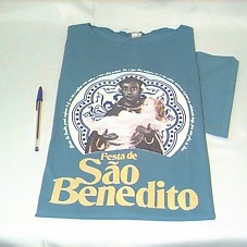 CAMISETA (TAM G) EM MALHA AZUL, DE MANGA CURTA. NA FRENTE, ESTAMPA COM IMAGEM DE SÃO BENEDITO E INSCRIÇÃO 'FESTA DE SÃO BENEDITO'. ATRÁS, SÍMBOLOS DAS ENTIDADES DE APOIO E PATROCINADORES.
