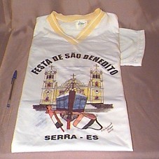 CAMISETA (TAM M) EM MALHA BRANCA, DE MANGA CURTA, GOLA EM 'V' AMARELA. NA FRENTE, ESTAMPA COM DESENHO DA FACHADA DE UMA IGREJA E UM BARCO 'PALÉRMO', COM RECO-RECO E TAMBOR. E, AINDA, A INSCRIÇÃO 'FESTA DE SÃO BENEDITO / SERRA-ES'.